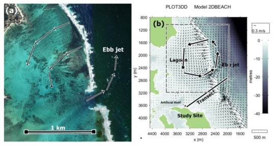 At the regional scale, wave breaking on the fringing reefs forces a current over the reef crest and into the lagoon [6]. This excess water flows along the lagoon to find an exit. The wide and deep reef passes, where the waves are not breaking, are a common exit location. This pattern is seen in the numerical model and in Google Earth images of the entrance (Figure 7a,b).