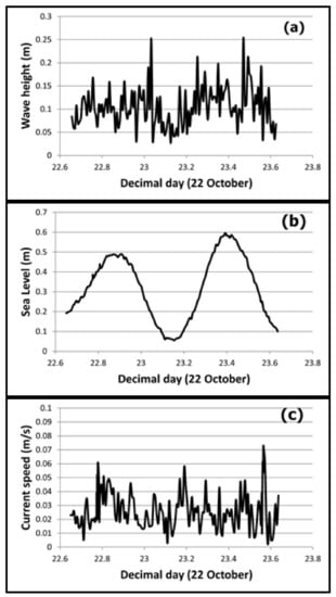 Figure 9. Measurements at the study site: (a) wave height with a trend line; (b) sea level; and (c) current speeds.