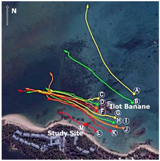 Around the study site, measured wave heights mostly increase when the depth of water over the reef crest is greater (Figure 9a,b). Currents measured by the Aquadopp instruments are typically small (0.01–0.06 ms−1) (Figure 9c), while the dominant current direction, depicted by drogues, is from east to west (Figure 10). From the computer modelling, waves pass around both sides of Ilot Banane and meet in the lee of the island due to the combined effect of refraction and diffraction (Figure 11). The same pattern can be seen in Google Earth images (Figure 5d). The largest wave travels around the eastern side of the island, and its orientation at the shore creates a longshore transport to the west at the beach. This small dominant wave can be seen in Figure 12a,b. Consequently, net transport is from east to west, which is further confirmed by the presence and growth of the sand spit to the west (Figure 3).