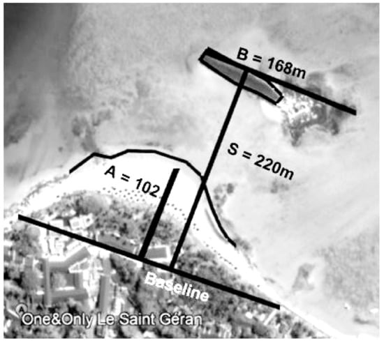 Figure 13. Offshore reef length (B), distance of reef offshore (S) and the salient apex width (A) relative to the baseline for the salient at St Geran.
