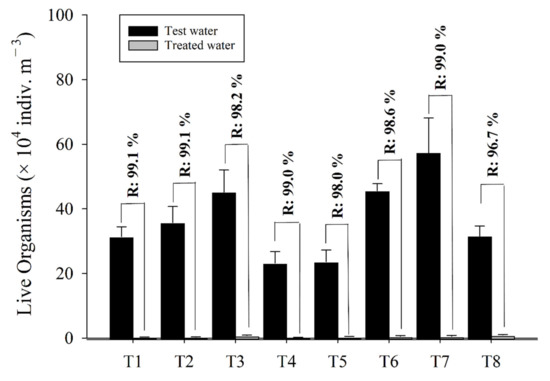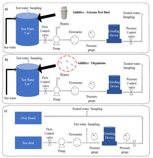The annual amount of ballast water that is used for the safe operation of vessels reaches approximately 3.5 gigatons and is discharged into the world’s oceans [1,2,3]. Various marine organisms, such as bacteria, microorganisms, and invertebrates are present in the ballast water. The presence of invasive alien species or toxic alien organisms could seriously affect the marine ecosystem, human health, and fishery economies around the ports where the ballast water is discharged [4,5,6,7]. Thus, to prevent disturbance of the marine ecosystem by ballast water, the International Maritime Organization (IMO) adopted the “International Convention for the Control and Management of Ships’ Ballast Water and Sediments” in February 2004 [8]. The Ballast Water Management Convention classifies organisms in ballast water into three size groups (≥50 μm, ≥10 and <50 μm, and <10 μm) and presents a discharge standard regulation for each size group. For example, for the ≥50 μm organisms, the number of viable organisms in the discharge water must be <10 individuals per m3. The Ballast Water Management Convention came into effect on 8 September 2017, and all vessels navigating worldwide must install a ballast water management system (BWMS) in accordance with the D-1(Ballast Water Exchange Standard) [9] or D-2 (Ballast Water Performance Standard) [10] standards by 8 September 2024.