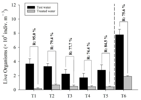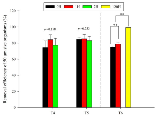 The additional removal effect of the GD on ≥50 μm organisms was also identified. Because the small zooplankton group with a size of <100 μm, which had low removal efficiency of the GD in this study, contained numerous species with a coin-shaped flat or flexible body, it was relatively less crushed and ground by the GD. Thus, although the mortality rate immediately after treatment was lower than that of adult copepods composed of chitin, the results show that most of the organisms that survived immediately after treatment died (≥99%) within 5 days due to the physical damage they received while passing through the GD. A study by Stehouwer et al. [23] regarding the performance evaluation of the BWMS adopting the UV method reported that it is difficult to confirm the maximum removal effect within 1 day even when the UV intensity is high and that it is thus necessary to check the additional death of organisms for up to 5 days when the UV intensity is low. Briski et al. [12] also reported on the possibility that additional death of organisms passing through the filter may occur. Although this study was able to identify an additional high removal effect for ≥50 μm organisms that passed through the GD, the corresponding experiment was performed only once, and the three-set analysis (immediately after treatment, 1 h after treatment, and 12 h after treatment) was insufficient in determining the mortality rate between 1 h and 120 h. Considering these limitations, further verification experiments are necessary.
