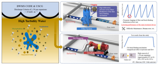 As of 2019, approximately 70% of all BWMSs installed on vessels utilize a filter unit as a pretreatment device to remove ≥50 μm organisms, resulting in many difficulties in operation and management due to filter clogging caused by frequent stoppages in coastal areas with a high turbidity as well as adherence at idle. This study has identified the performance of the GD based on a flow-through method through solid grinding efficiency evaluation and evaluated the removal efficiency on zooplankton groups to improve the treatment efficiency of the main BWMS while overcoming the disadvantages of the conventional filtration devices. The results show that the GD effectively kills organisms (PT: approximately 94%, FST: 81%) and enables stable operation in a high-turbidity environment (Figure 7).