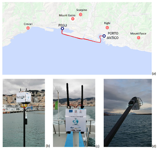 Table 3 summarizes the results of the test performed in coastal waters in terms of packet loss ratio for each pair of end-node and gateway. The total amount of packets transmitted by the Field Test end-node, both automatically and triggered by the operator on board the vessel, was 180. The other employed end-nodes transmitted automatically, and the number of packets sent was 97 for the spectrometer, 45 for the LT I/O Controller 1, and 71 for the end-node TIAMO 3. The LT I/O Controller 2 was not operating due to a battery fault. At the arrival and departure terminal in Pegli, conditions of the sea did not allow the operator to maintain the spectrometer operational, therefore it had to be switched off: this explains the high packet loss ratio for the spectrometer with respect to the gateways located at Crevari and Scarpino, although they were both in LOS condition. LT I/O Controller 1 was operating only for the back passage from Pegli to Porto Antico, and this is the reason why it was experienced an elevated number of missed received packets again for LG308 1 whose sight was partially occluded during the track of the vessel turning back to Porto Antico.