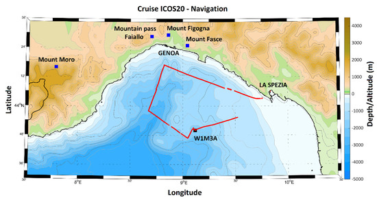 The second test was performed during the research cruise ICOS20 from 19 October up to 21 October 2020 with the R/V Dallaporta operated by the National Research Council of Italy. The research cruise started and ended in La Spezia, and, during the three days of navigation, the route depended on the need for performing standard oceanographic measurements (i.e., Conductivity Temperature Depth (CTD) casts and water sampling with the on-board rosette) in the basin and around the W1M3A observatory [