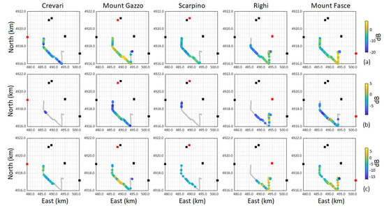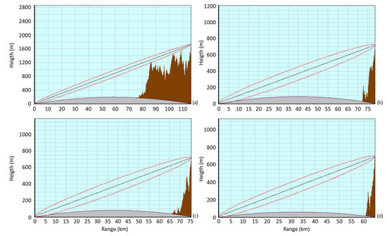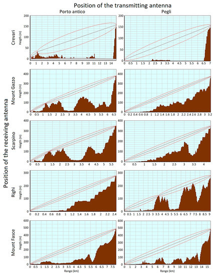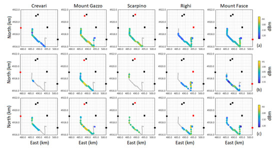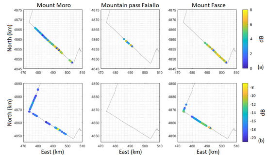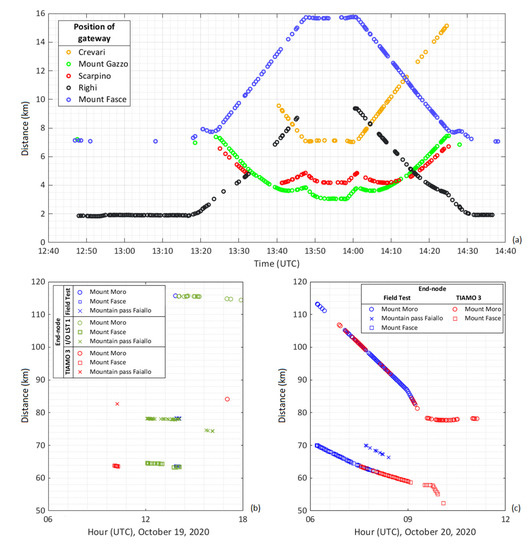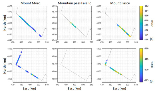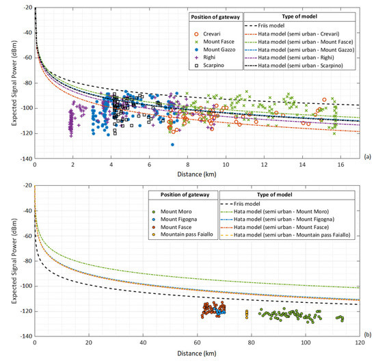 Figure 11b). This conclusion may also be consistent considering the presence of obstacles (buildings, hills, and mounts) along the terminal part of the radio path from the off-shore end-nodes to the gateways on the mountains. As the distance between end-nodes and gateways increases, the curves based on the equations by Friis and by Hata (with semi-urban conditions) tend to be similar for the gateway located at an altitude of about 700 m (Mount Fasce, Mountain pass Faiallo, Mount Figogna) whereas, when the altitude is greater than 1700 m (i.e., Mount Moro) the difference between the two models is of about 20 dBm.