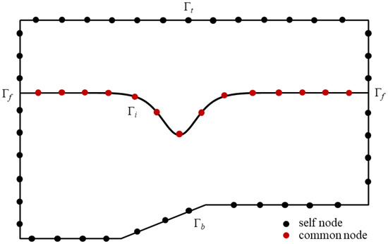 The two fluid layers have different densities such that the multi-domain boundary element method [43] should be adopted. For the two-layer computation domain, the boundary elements can be divided into two types, which are self nodes and common nodes, as shown in Figure 2. The boundary integral Equation (9) can be expressed as Equation (10).