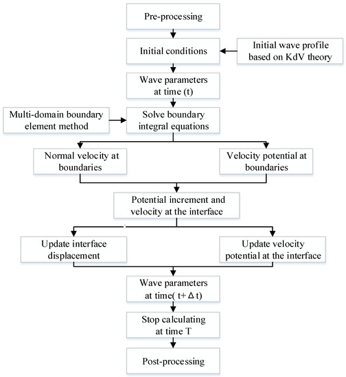 The interface and their potential distribution are updated using the fourth-order Runge–Kutta method. The initial solitary waves are given based on analytical theory, and the propagation processes are then calculated using fully nonlinear numerical models. For small-amplitude solitary waves, the initial condition is provided by the KdV theory solutions for a two-layer fluid [46]. The numerical simulations are performed using calculation codes developed based on MATLAB, and the flowchart which numerical simulations followed in the present study is shown in Figure 3.