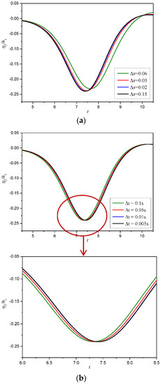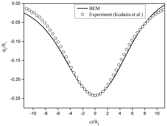 The verification of convergence in grid size and time step was conducted, and a comparison of the interfacial profiles simulated by the multi-domain boundary element method with various grid sizes is shown in Figure 4. It was found that the computational results converge when the grid size is along the length of the computational domain and the time step is , grid size of , and time step are adopted in the present numerical simulations. To evaluate the BEM model, we compared the time history of the displacement of the interface between the two liquid layers obtained from the computations with that of the experiments [47], as shown in Figure 5. Wave profiles are non-dimensionalized using the top layer thickness and the calculated wave speed . The computational results were obtained using BEM with a rigid lid boundary condition at the free surface, and the computational results of the BEM are in good agreement with the experimental data.