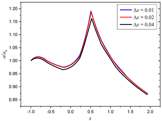 The evolution of internal solitary waves was conducted, and the validation of amplitude variation while ISWs propagating over slope bottom in regard to mesh sizes is exhibited in Figure 7. It can be found that the convergence of present method to calculate the wave evolution can be ensured for the mesh scale . The wave amplitude variations for different slope heights and initial amplitudes when slope angle β = 20° are plotted in Figure 8. In the first stage (horizontal location x from −1 m to 0), the amplitude is nearly constant when the ISWs propagates above the flat bottom before slope topography, which is the natural attribute of solitary waves. In the second stage (from the slope start point x = 0 to the slope shoulder), the amplitude increases sharply for the up-slope topography and reaches a maximum at the shoulder of the slope, which can explain why the ISWs are observed around the offshore and coastal areas frequently. In the third stage (after the slope shoulder), the amplitude decreases significantly when the ISWs passes the shoulder and propagates over the plateau. The maximum amplitude increases with an increase in the slope height and can reach a nearly 20% increase from the original amplitude for the slope height hs = 0.18 m and initial dimensionless amplitude a0/h1 = 0.4. The amplitude decreases more sharply and reaches a smaller value after the location nearly x =1.25 m (Figure 4b) for a larger slope height owing to the energy reassignment while shoaling along the plateau because the wave suffers more energy rearrangement on the large height slope bottom.