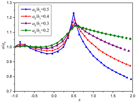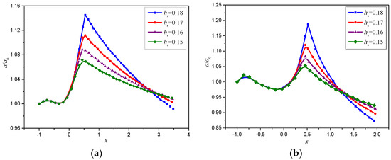 Variation in dimensionless amplitude for different initial amplitudes and slope height along the propagation direction. The cases for the initial dimensionless amplitudes a0/h1 = 0.2 (a) and 0.4 (b), angle β = 20°, respectively.