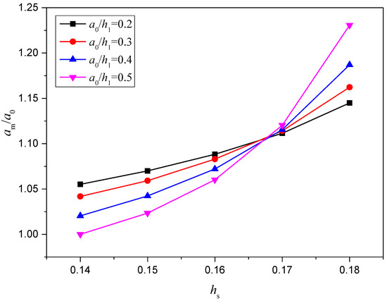 The variation of ISWs amplitudes versus different densities jump of two-layer fluids is shown in Figure 11, and it can be found that ISWs reach a larger value of amplitude for the larger densities jump. Meanwhile, the degree of attenuation is not affected by densities jump obviously, which is different with the effect of slope parameters and initial amplitude. Figure 12 shows the variation in the dimensionless maximum wave amplitude am/a0 for different slope heights, which indicates that the amplitude maximum increases with an increase in the slope height owing to the strong interaction between the wave and the bottom of the slope with a larger height. The increase in the maximum amplitude becomes sharper for the higher slope, which also indicates the apparent effect of slope topography on the evolution of internal solitary waves.