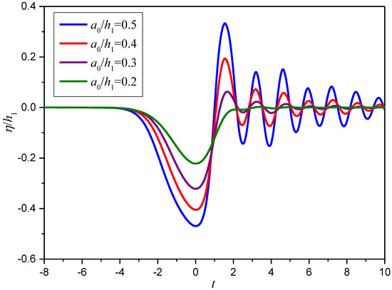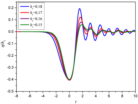 The morphological characteristics of the tail waves’ time history profile at the observation point (horizontal location x = 1 m) under different slope height conditions are shown in Figure 14. Meanwhile, the moment when wave trough reaches the observation point is set to zero for the intuitional comparison. It was found that the higher the slope height, the more apparent the tail wave, which has a larger wave amplitude and a higher frequency. The maximum displacement of tail waves can reach 50% of ISWs amplitude for the case hs = 0.18 and a0/h1 = 0.4. The characteristics of the tail wave under different initial wave amplitude conditions at the horizontal location (x = 1 m) for the slope height hs = 0.18 and slope angle β = 20° are shown in Figure 15. It was found that the characteristics of the tail waves are also closely related to the value of the initial wave amplitude. The larger the initial wave amplitude, the more apparent the tail wave, which has a larger wave amplitude. However, the tail waves generated under different initial amplitude conditions had the same frequency. Meanwhile, it was also found that the larger the initial wave amplitude, the more apparent the asymmetry of the evolved waveform, and the smoother the front face.
