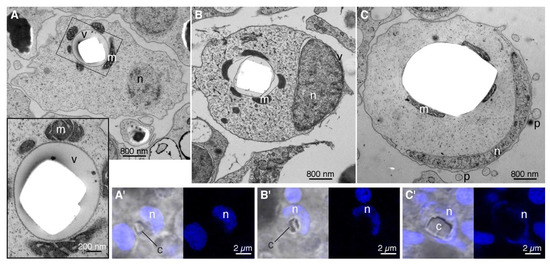 Transmission electron and light microscopy of developing and mature crystal cells. (A–C)—ultrathin sections in TEM. (A’–C’)—light microscopy of Hoechst labeling (blue) shown superimposed on DIC image (left) and separately (right). (A)—an early stage of crystal cell development characterized by a very small crystal (<800 nm), rounded nucleus, and elongated shape of the cell. Inset is a magnified boxed region, showing a vacuole with a growing crystal. (A’)—a crystal cell at the same stage as shown in (A), with a small crystal and bean-shaped nucleus. (B)—the crystal becomes larger, the nucleus adheres to the cell membrane and begins to adopt cup shape, and the cell rounds up. (B’)—a stage corresponding to (B) when the nucleus starts to bend. (C)—mature crystal cell with a large crystal occupying the entire volume of the vacuole and a thin cup-shaped nucleus. (C’)—mature crystal cell corresponding to that in (C) with a large crystal and a very thin nucleus. c—crystal, m—mitochondrion, n—crystal cell nucleus, p—crystal cell protrusions, v—vacuole with growing crystal.