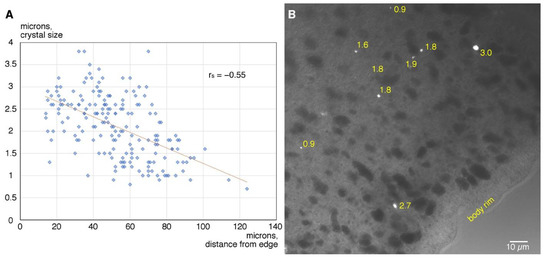 Distribution of crystals of different size. Crystal cells are distributed along the rim of the animal and absent from central regions of the body [3,18]. Measurement of the distance from the body edge to individual crystals (n = 189) indicates that crystal cells are scattered within a concentric region starting approximately 15 µm from the edge and spreading inside up to 120 µm from the edge (Figure 2A). Within this belt-like zone, smaller crystals selectively occupy the deeper region, while large crystals are located closer to the periphery (Figure 2A,B). Indeed, there is a negative correlation between the size of a crystal and its distance from the rim of the body (Spearman’s rs = −0.55, p = 3.76 × 10−16; homoscedasticity was confirmed with Breusch Pagan test giving a p value of 0.66).