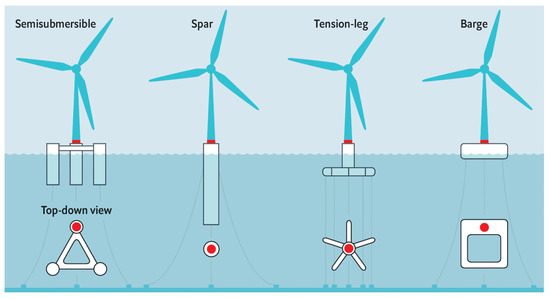 FOWT can be classified into four major categories from the aspect of how to achieve hydrostatic stability, as shown in Figure 1. One is the spar type that achieves roll/pitch stability by its deeply installed ballast. The Hywind spar developed by Equinor is the first successfully commercialized floating wind concept and it has been applied in several practicing projects, including the Scotland floating wind farm with a total capacity of 30 MW. The second category, the barge type, is stabilized by the buoyancy provided by its large water plane area. The Ideol concept developed by the BW is a successful commercial product that is used in multiple floating wind projects in France and Japan. The tension leg platform (TLP) is another FOWT category that is stabilized by taut mooring lines. Due to the high cost and difficulty in installation, this concept has not been applied in a demo project yet. The other category is semi-submersible, mainly stabilized by buoyancy. Since the semisubmersible type is applicable for a variety of water depths and has a good hydrodynamic performance, it is a very promising technology for floating wind utilization [3].