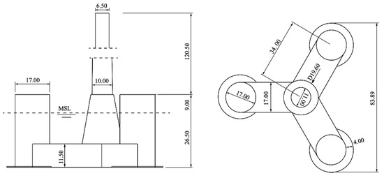 The design displacement of the AcitiveFloat platform is 36,431.22 m3. The operation draught and transportation draft are 26.5 m and 11~13 m, respectively. The vertical coordinates of the center of mass and center of buoyancy are −11.09 m and −15.83 m. The platform mass including the ballast is 34,387,200 kg. The inertias of mass are 1.57 × 1010 kg·m2, 1.57 × 1010 kg·m2 and 2.58 × 1010 kg·m2, respectively, for the roll, pitch, and yaw directions. Table 2 presents the key parameters of the ActiveFloat platform.