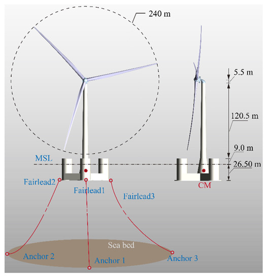 The mooring system consists of three catenary cables. The upstretched length and diameter of each mooring line are 614 m and 0.16 m, respectively. The mass density and equivalent axial stiffness of the mooring line are 561.2 kg/m and 2.3 GN, respectively. The mooring system will provide a considerable stiffness to constrain the surge motion of the platform below 15 m. Table 3 gives the coordinates of the fairleads and anchors of the mooring lines. Figure 3 presents a schematic diagram of the IEA 15 MW reference wind turbine mounted on the ActiveFloat platform.