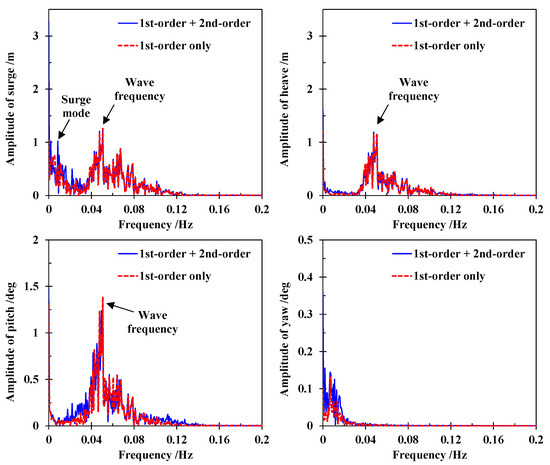 The spectral responses of the platform motions are obtained by applying the Fast Fourier Transformation (FFT). Figure 8 presents the spectra of the platform surge and yaw motions to illustrate the contributions of the second-order hydrodynamic loads. It is observed that the surge component of the mean hydrodynamic force is significantly increased due to the presence of second-order wave excitation, as confirmed by the larger amplitude at zero frequency. In addition, the surge mode is activated by the second-order hydrodynamic loads. The amplitude at the surge nature frequency is almost equivalent to that at the spectral peak frequency of the irregular wave (0.054 Hz). The spectra of heave and pitch motions indicate that the second-order hydrodynamics only enhances the mean force magnitude. The responses corresponding to the wave frequency are almost not affected by the involvement of second-order hydrodynamics. Due to the high magnitude of the yaw QTF items in low frequency area, the yaw amplitude is increased accordingly, especially at zero frequency. This implies that the mean yaw moment is much larger when considering the contribution of second-order loads.