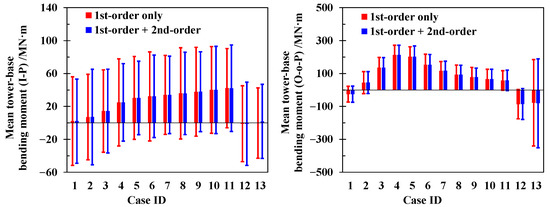 At the tower-base, the bending moment consists of the contribution of aerodynamic forces and hydrodynamic loads. In order to analyze the effect of second-order hydrodynamics, Figure 9 presents the maximum bending moments at the tower-base under each examined load case, where I-P means the in-plane component and O-o-P denotes the out-of-plane component that is aligned with the wind–wave inflow direction. It is interesting to find that the second-order hydrodynamic loads increase the tower-base bending moments in some cases but also decrease the bending moments in the other cases when the wind turbine is operating for power production. This is because the hydrodynamic force is acting on the platform that is below the tower-base, while the aerodynamic loads are acting on the rotor above the tower-base. In some cases, the larger hydrodynamic loads decrease the bending moment when its induced bending moment is inverse to that cased by the aerodynamic thrust. In addition, due to the complex interaction between hydrodynamics, aerodynamics, and structural responses, the larger hydrodynamic loads with the contribution of second-order wave excitations are not expected to increase the bending moments at the tower base.