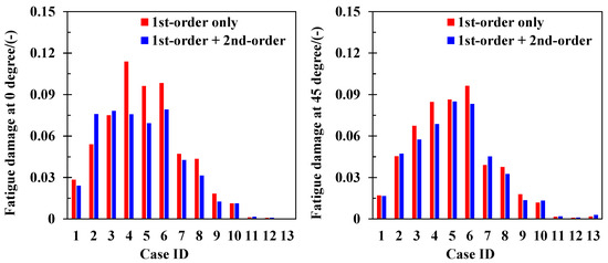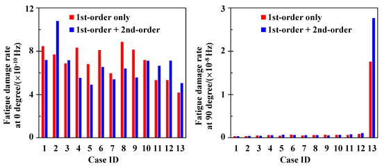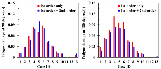 Considering the occurrence probability, the fatigue damage at different orientation angles of the tower-base over 25 years is predicted and presented in Figure 14. It is found that load cases #3~#6 are the major contributors to the overall damage at the tower-base for each assessment point. It is interesting to find that the damage is smaller if only the first-order wave excitations are considered. This implies that the structural strength design at the tower-base is relatively conservative if the second-order hydrodynamics are not considered in the fatigue analysis. Although the extreme wave condition produces a very large damage rate, the accumulative damage within 25 years caused by the extreme wave condition is less than 0.015 due to its low occurrence probability.