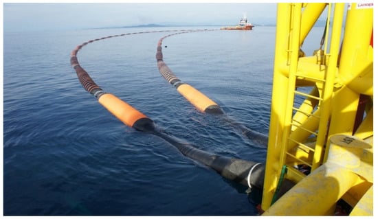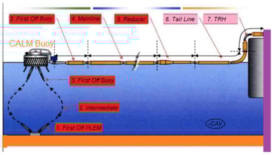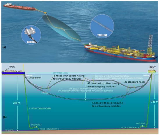 - Mayau, D.; Rampi, L. Trelline—A new flexible deepwater offloading line (OLL). In Proceedings of the Sixteenth International Offshore and Polar Engineering Conference, San Francisco, CA, USA, 28 May–2 June 2006; Available online: https://onepetro.org/ISOPEIOPEC/proceedings-abstract/ISOPE06/All-ISOPE06/ISOPE-I-06-127/9875 (accessed on 12 October 2021).