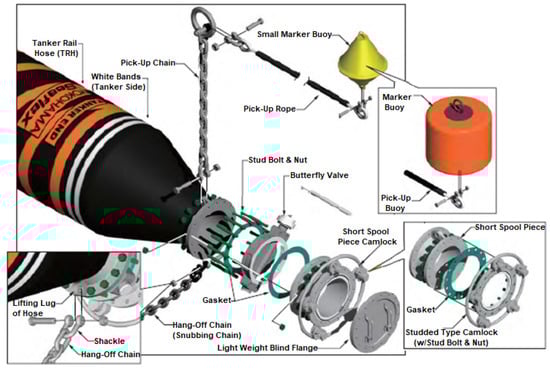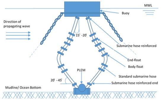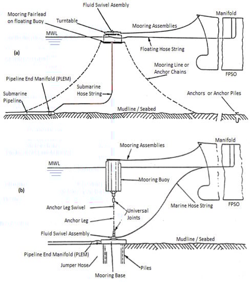 Recently, there has been a campaign in the marine industry for sustainable fluid transfer operations as one of the critical aspects of maritime and naval operations []. This development is in line with the UN SDG’s goal of sustainability. In the light of that, a review on sustainable fluid transfer and loading operations using marine hose has been conducted in this research. Depending on certain considerations, a variety of offshore mooring terminals are situated at different locations. Three such locations are: the terminals that are sheltered at moor-anchorage regions; the terminals that are located outside-of-port’s limits; and the terminals that are within protected mooring ports. In such cases, large ships that are unable to dock near the port may have larger drafts, thus making approaching ports difficult. It could also be that these large vessels may require that terminals are berthed ashore while the cargos are transferred offshore [,,,]. Therefore, it is necessary that the different terminals that could be considered for fluid transfer are discussed. In principle, the bonded marine hoses must be suitable for the fluid content; as such, necessary tests have to be carried out, as discussed in this study. Generally, floating offshore structures (FOS) are designed to be load-bearing, with connection components for both moorings and hose-risers. Examples of FOS include the Catenary Anchor Leg Mooring (CALM) buoys or Single Anchor Leg Mooring (SALM) buoys, the shuttle tankers or Floating Production Storage and Offloading (FPSO) vessels. The connection components include the bonded marine hoses, Hose End Valves (HEVs), Marine Breakaway Coupling (MBC), and Pipeline End Manifold (PLEM). Conversely, the ancillary components used in attaching the hoses to other hose sections or the tanker/buoy manifolds include the shackles, chain pick-up, and butterfly valves.