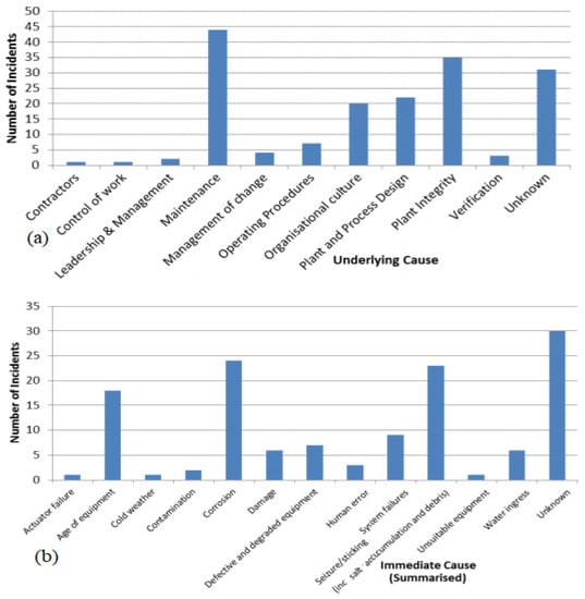 Incidents from riser emergency shutdown valve failures in HSE 2015 report, for (a) underlying causes and (b) immediate causes (Source: HSE UK, in public domain).