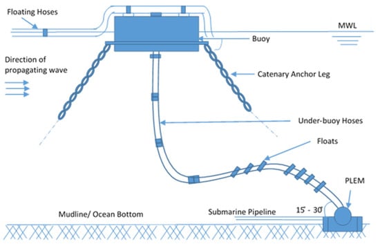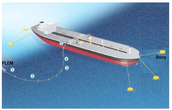 All these connection components are utilized on the marine hose via a variety of sustainable mooring methods, such as these three formations. The first form, also known as Multiple Buoy Mooring (MBM), typically consists of the following main components: mooring system with buoys, mooring legs and anchor points, pipeline end manifold (PLEM), pipeline to shore, subsea control system, and hose string with pick-up arrangement [,,,]. The many buoys are fastened to the seabed in a rectangular pattern with mooring lines and marine anchors, allowing safe mooring of a vessel positioned between the buoys with tug assistance. The bow of the ship is tied to the buoy surrounding it using both anchors or forward mooring buoys, while the stern is secured to the buoy around it using the stern and quarter mooring system. It keeps the ship in a fixed position and prevents it from weathervaning. The buoys serve as powerful anchor points for the vessel’s on-board mooring lines.