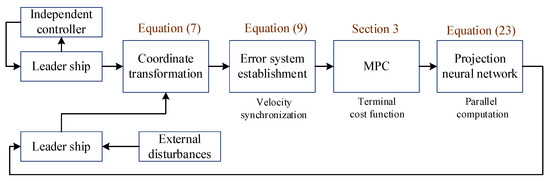 MPC is a natural solution for the multi-variable control problem of Equation (9) because the variables can be treated as an objective function systematically where the optimization can be applied [21,22,23,40,41,42]. Additionally, the control inputs of the DP ship are constrained in practice, so it is particularly important for sailing in proximity. Considering the large inertia of ship motion is the main cause for collision, the predictive mechanism of MPC allows it to handle the constraint ahead of time, which can mitigate the influence of the large inertia of ship motion. Therefore, in this paper, a novel synchronization controller on account of model predictive control (MPC) for dynamic positioning (DP) ships is devised to achieve underway replenishment. Firstly, a novel synchronization controller based on MPC is devised to ensure the synchronization of not only the position and orientation but the velocities; furthermore, it is a beneficial solution for its advantages in handling the control input constraints ignored in most studies of underway replenishment. Secondly, a neurodynamic optimization system is applied to the implementation of MPC, which can improve computational efficiency and shorten the simulation time. Thirdly, stability, frequently neglected by traditional MPC, is ensured by the means of adding a terminal cost function exported from the Lyapunov equation into an objective function. Additionally, the design block diagram of the presented synchronization controller is shown in Figure 1.