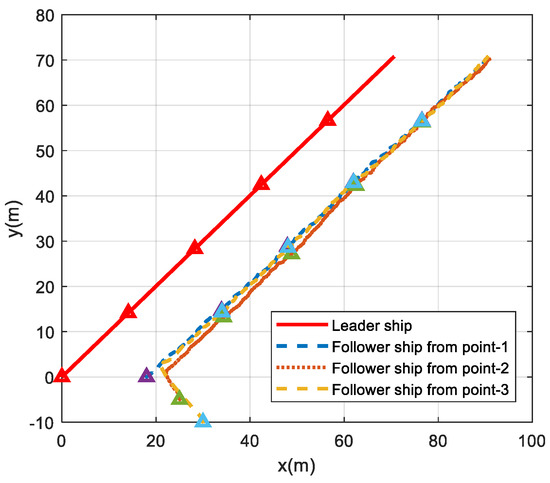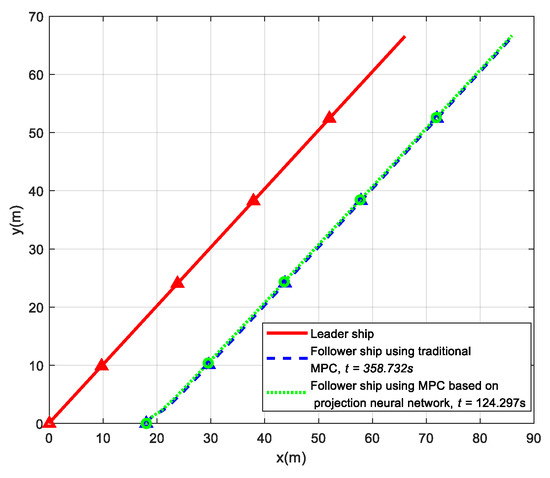 Multiple simulations are carried out to illustrate the effectiveness and advantages of the presented novel synchronization controller on account of model predictive control. Specifically, the multiple simulations can be segmented into two groups: the first group of simulations is to illustrate the effectiveness of the presented synchronization controller from the different initial points with disturbances, the disparate predictive horizon, and the changes in velocities and course; the advantages of the presented synchronization con-troller are illustrated by the two comparative simulations, the first is between PID, LQR, and the presented synchronization controller with and without input constraints, and the other is between conventional MPC and the presented MPC integrating with PNN. The parameters of the simulation model are given in [33], specifically, , , , , and . And the parameter of PNN is set as .