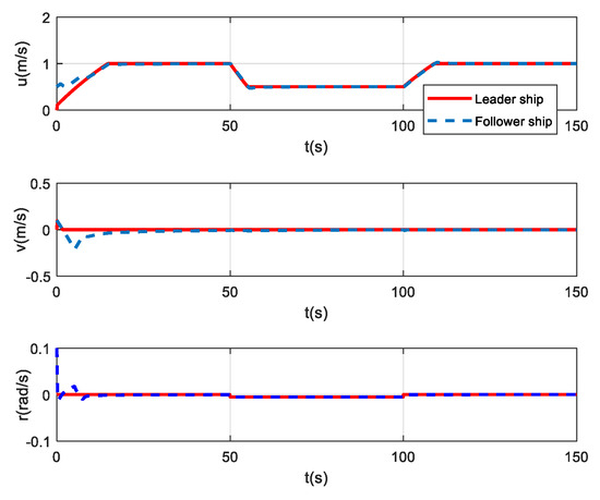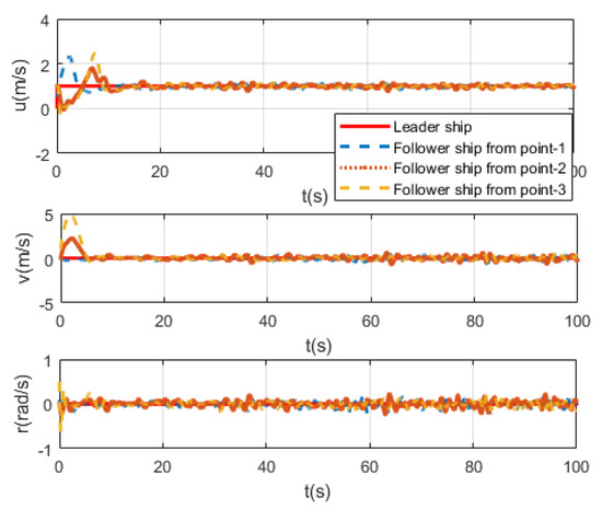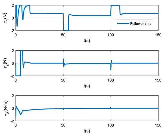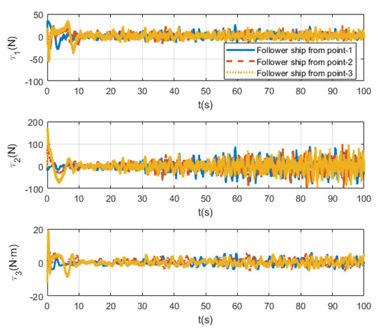 In addition, the simulation results are shown in Figure 2, Figure 3 and Figure 4. Specifically, Figure 2 denotes the tracking performance of the presented synchronization control from different initial points with disturbances. Figure 3 represents the synchronization of velocities. Additionally, Figure 4 indicates the corresponding responses of control inputs. For traditional underway replenishment, normally, it involves two separated stages. First, the follower ship is controlled to the predefined location in the formation independently. Then, the velocities are controlled to synchronize with the leader ship. In this section, the position and velocities of the follower ship are designed to be control outputs together. As shown in Figure 2 and Figure 3, the follower vessel can move along with the leader ship with a given offset from different initial points with disturbances automatically. Meanwhile, the synchronization of velocities is achieved. After all, the effectiveness of the presented synchronization controller is illustrated by the simulation results.