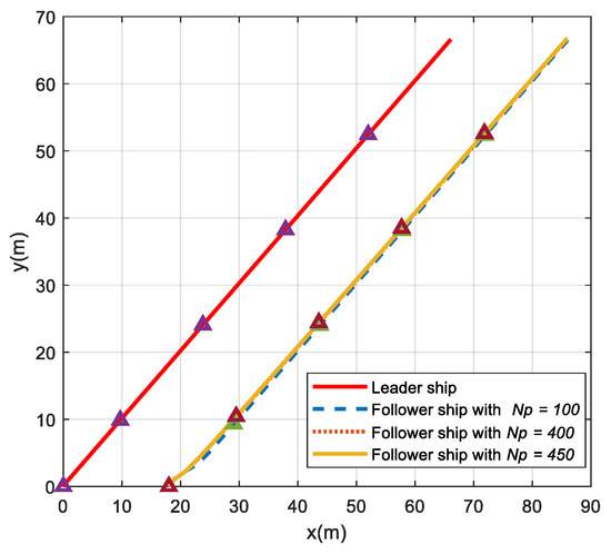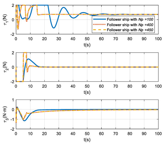 The predictive horizon is the key control parameter of MPC, representing the length of prediction. The ship motion normally suffers from large inertia, which is rather dangerous for navigation safety. The predictive capability of MPC makes it a favorable solution, because the control action can be decided ahead of time by virtue of the predicted further responses. This is crucial for underway replenishment to avoid the collision. Therefore, in this section, the simulations are carried out by set different predictive horizon varies as 100, 400, and 450 to illustrate the effectiveness of the presented synchronization controller. It is worth noting that indicates that the future responses in 1 s () are predicted and then used in the control design. The simulation results are shown in Figure 5, Figure 6 and Figure 7, which are the tracking performance, synchronization of velocities, and the corresponding responses of control inputs with different predictive horizons.