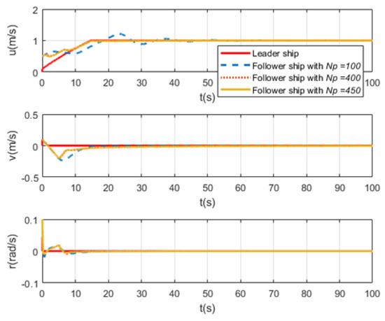 It is worth noting that the control input constraints , , and are considered in this case and the forthcoming cases. As we can see, when , the responses of the follower ship fluctuate, particularly in the surge velocity, see Figure 6; when and , the responses of the follower ship are nearly the same. It can be concluded that when , the control performance does not improve much as increases. Therefore, in this paper, the predictive horizon is set as , i.e., the control action can be taken in advance approximately 4 s.