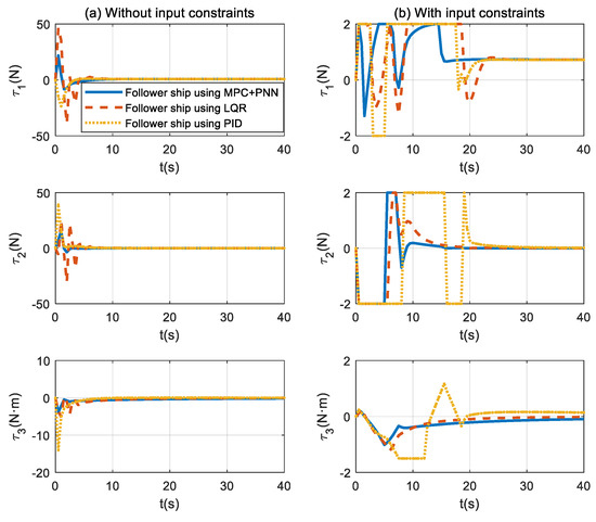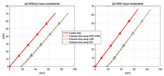 In Figure 9 scenario (b), as we can see, from the perspective of settling time and overshoot, the best control performance is realized by means of the presented MPC design. The reason is that the concept of MPC is to use the predicted future responses to determine current control action, and in this way, the violation of constraints can be predicted and avoided in advance. The LQR is better than PID because it is an optimal control method that can handle the multi-variable control problem such as underway replenishment in a way that PID does not attempt. For underway replenishment, not only the position and orientation but also velocities are required to be synchronized; moreover, the control input constraints exist in practice. Nevertheless, the existing references [11,12] use the PID method to design the controller, while control input constraints are not considered in all references [11,12,13]. It motivates the present study.