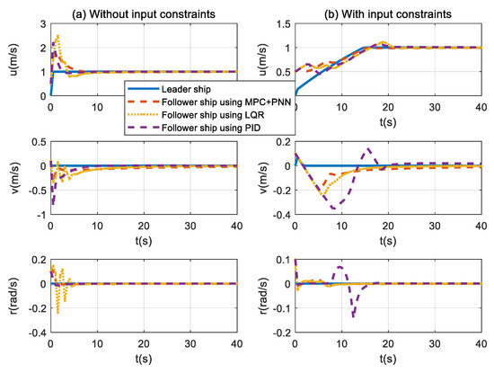 Two scenarios, i.e., scenario (a): comparative studies without input constraints and scenario (b): comparative studies with input constraints, are conducted. The comparative performance is shown in Figure 8, Figure 9 and Figure 10. In scenario (a), the control performance is just slightly different using PID, LQR, and the presented control design. However, when the input constraints are initiated, the performance are very different, particularly in the synchronization of velocities, see Figure 9. Note that the length of simulations is 100 s in this section. However, in order to show the results clearly, only the transit process, where the main difference appears, is given in Figure 9 and Figure 10.