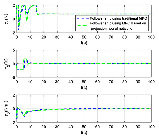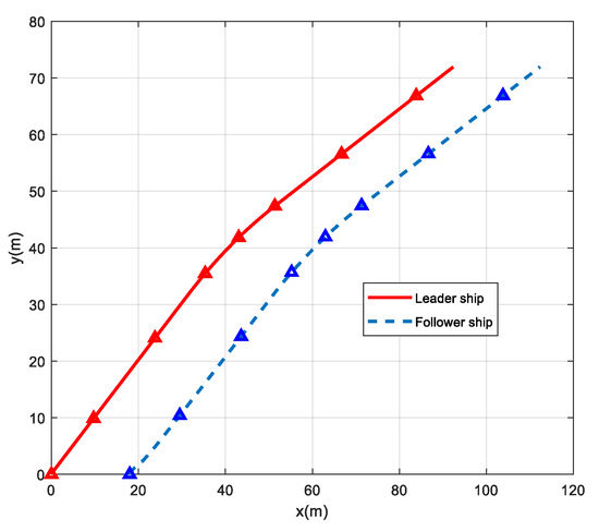 Note that, in Section 4.1, the predictive horizon is and the control performance seems fine because the control input constraints are not initiated, see Figure 4. The authors use such arrangement to show the influences of control input constraints, which is frequently ignored in underway replenishment [11,12,13]. However, it truly exists in reality. The details are reported the following case.