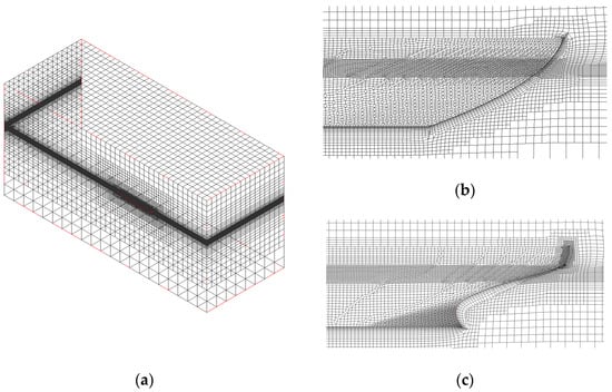 Ship hull mesh. (a) Grid of all areas, (b) Bow grid, (c) Stern grid.