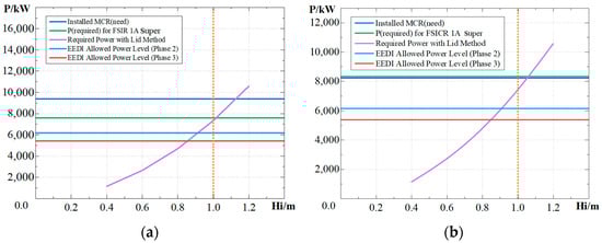 For the four ice classes, the power requirements when using the FSICR equation is on average higher than that of the Lindqvist method. Whether it meets the requirements of the EEDI Phases is demonstrated by red and green in Table 11 (The red area indicates that the power requirement is not met, and the green area indicates that the power requirement is met). It is to be noted that the power requirement calculated by FSICR formula is usually over-rated for large ships and alternative reduced power can be accepted with proper ice resistance calculation [].