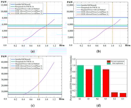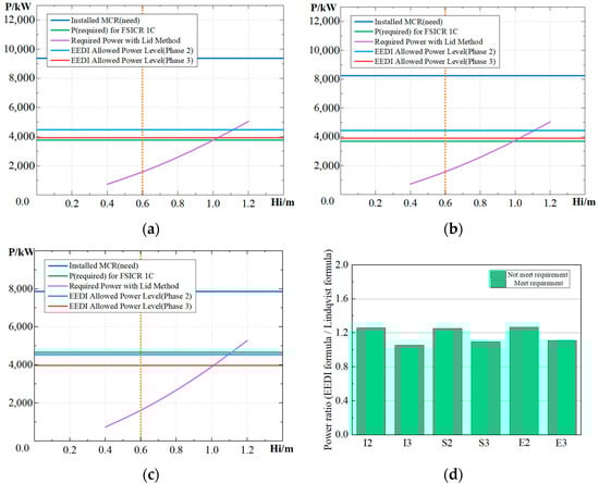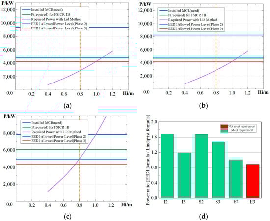 The MCR, EEDI allowed power (Phase 2 and 3), required power calculated by Lindqvist method and FSICR of class 1C-1A Super ice class (Speed is set at 5 knots as required by FSICR) are calculated following the methods described above. Lindqvist and FSICR formula are used for the ice resistance calculation for main engine power and compared with the EEDI requirements in Figure 8, Figure 9, Figure 10 and Figure 11 (a, b, c for different bow forms) for different ice classes. Figure 8, Figure 9, Figure 10 and Figure 11 (d) are the comparisons for power requirements obtained from Lindqvist formula and EEDI requirements. In these figures, when the ratio is greater than 1, shown as green, EEDI requirement are satisfied for the considered ice classes and bow forms; when the ratio is less than 1, shown as red, then the EEDI requirement is not satisfied. In Figure 8, Figure 9, Figure 10 and Figure 11 (d), “I2 (I3)” represents EEDI Phase 2 (Phase 3) for the traditional icebreaker bow, “S2 (S3)” represents EEDI Phase 2 (Phase 3) for the semi bow, “E2 (E3)” represent EEDI Phase 2 (Phase 3) for the EEDI bow form.