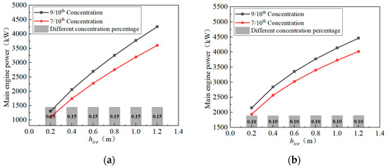 Power calculation with different pack ice concentration. (a) Traditional icebreaker bow, (b) Semi bow.