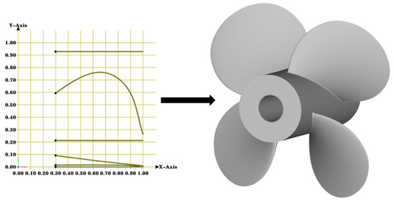 This paper adopts the method of fully parametric modeling [13], and the six parameters of the propeller were fitted to the six parametric curves that control the deformation of the propeller. The model is as shown in Figure 2. On the left is the six parametric curves representing the pitch curve and the chord length: curve, camber curve, thickness curve, pitch curve, and side slope curve. A fully parametric model of the propeller was established based on these six curves.