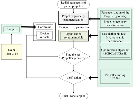 Figure 5 is a flow chart of the propeller optimization design procedure. First, using the radial parameters of the propeller, the propeller geometric parameterization was modelled. Second, the CFD numerical calculation was performed to obtain the hydrodynamic performance, the thrust of the propeller coefficients and open water efficiency were taken as the design optimization goals. Third, the propeller shape is changed following the SOBOL algorithm and to perform a global uniform search, and then the NSGA-II algorithm was used to perform multi-objective optimization. The maximum torque Qmax calculated by IACS Polar UR serves as the optimization constraint to make sure the toque from the deformed propeller cannot exceed the original propeller.