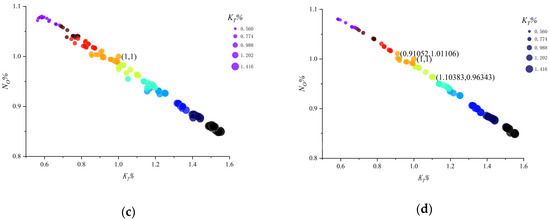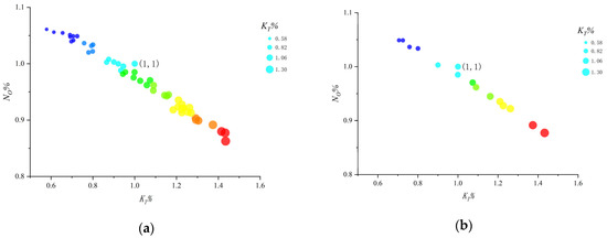 Using the above-mentioned pitch curve, thickness curve, and camber curve as design optimization variables, the propeller was globally optimized with multiple objectives at the design advance speed J = 0.4. The optimization goal was the open water efficiency and thrust coefficient of the propeller. The constraint condition was that the maximum torque caused by the optimized propeller to the shafting was less than that by the parent propeller. The NSGA-II algorithm was used for multi-objective optimization. Iteration was used to get the optimal propeller type scheme. Figure 7 are the comparison of hydrodynamic performance of deformed propellers comparing to those of the parent propeller, in which, the y-axis represents the ratio of open-water efficiency of deformed propeller to that of the parent propeller, the x-axis represents the ratio of thrust coefficients of the deformed propellers to that of the parent propellers, and the coordinate point (1,1) in Figure 7 is the parent propeller data point. The color of the bubble represents the open water efficiency and the diameter represents the thrust coefficient.