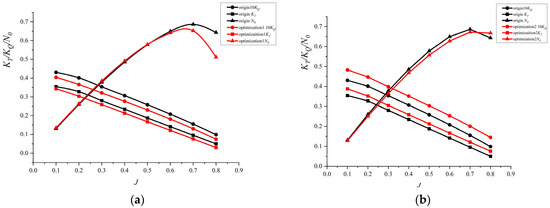Comparison of open water performance curves between the parent propeller and the optimized propeller. (a) Comparison chart of parent propeller and optimized propeller 1; (b) comparison chart of parent propeller and optimized propeller 2.