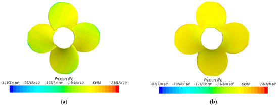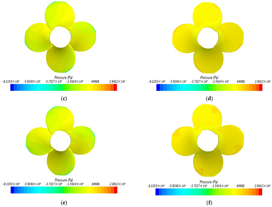 Pressure distribution at propeller surface. (a) Parent blade back pressure; (b) parent blade front pressure; (c) Optimization 1 blade back pressure; (d) Optimization 1 blade front pressure (e) Optimization 2 blade back pressure; (f) Optimization 2 blade front pressure.