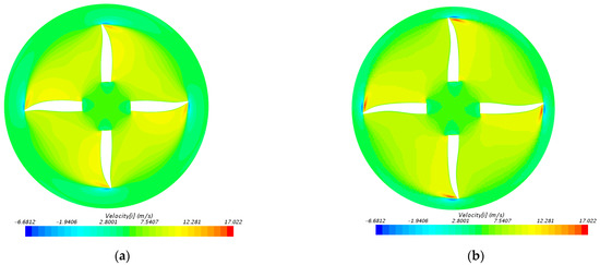The X = 0 and Y = 0 grid sections are shown in Figure 4. In the figure, X and Y are the scale values in the coordinate axis direction. The grid is divided by the software’s own grid generator, the boundary layer grid is divided by prismatic layer grid, and the rotation domain and fluid domain are hexahedral grid generated by the cut volume grid generator.