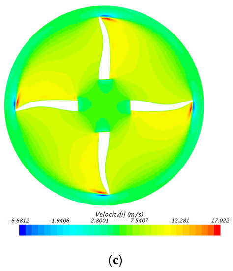Axial velocity at propeller surface. (a) Axial velocity of parent blade; (b) Optimization 1 the axial velocity of blade; (c) optimization 2 blade axial velocity.