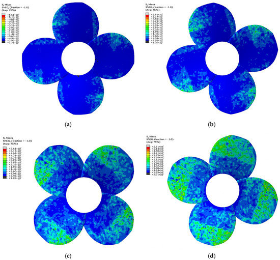 Stress distribution during propeller and ice cutting. (a) Stress distribution during 0.035 s propeller and ice cutting; (b) stress distribution during 0.04 s propeller and ice cutting; (c) stress distribution during 0.05 s propeller and ice cutting; (d) stress distribution during 0.06 s propeller and ice cutting.