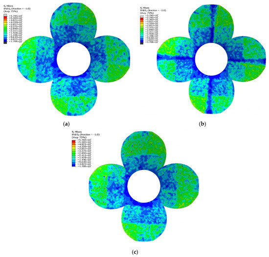 Comparison of the surface stress of the original propeller, the optimization 1 propeller, and the optimization 2 propeller during ice cutting. (a) Comparison of surface stress of parent propeller and ice cutting; (b) Optimization 1 comparison of surface stress between propeller and ice cutting; (c) Optimization 2 comparison of surface stress between propeller and ice cutting.